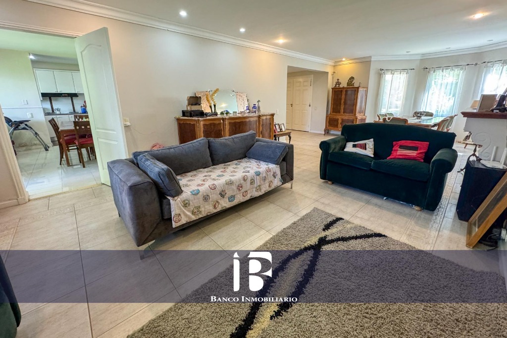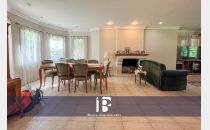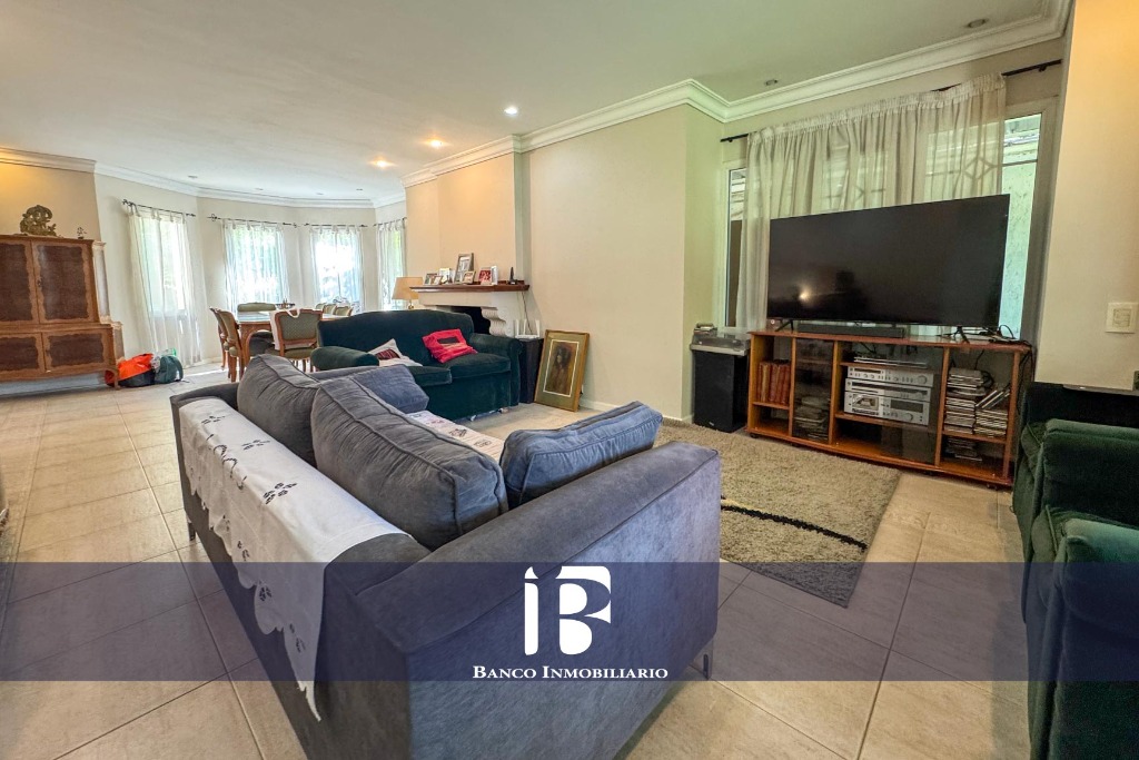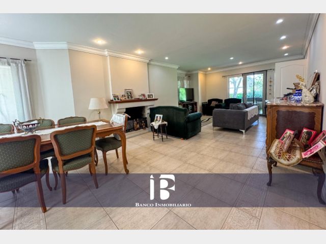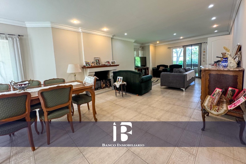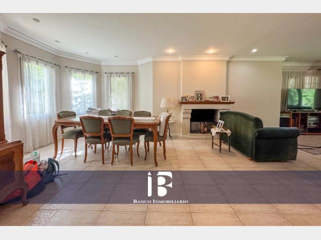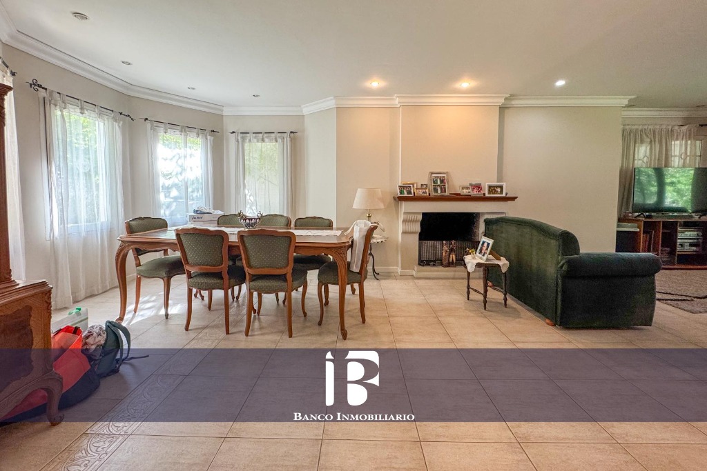 Living - Comedor con hogar a leña, ambiente muy luminoso con ventanales hacia el jardín