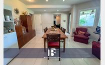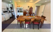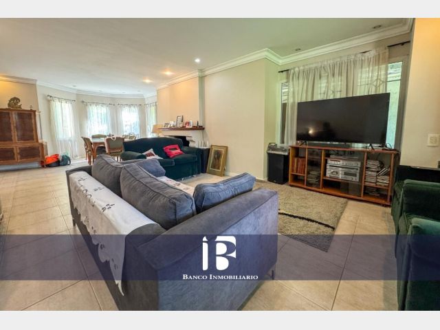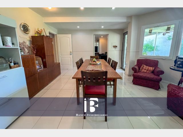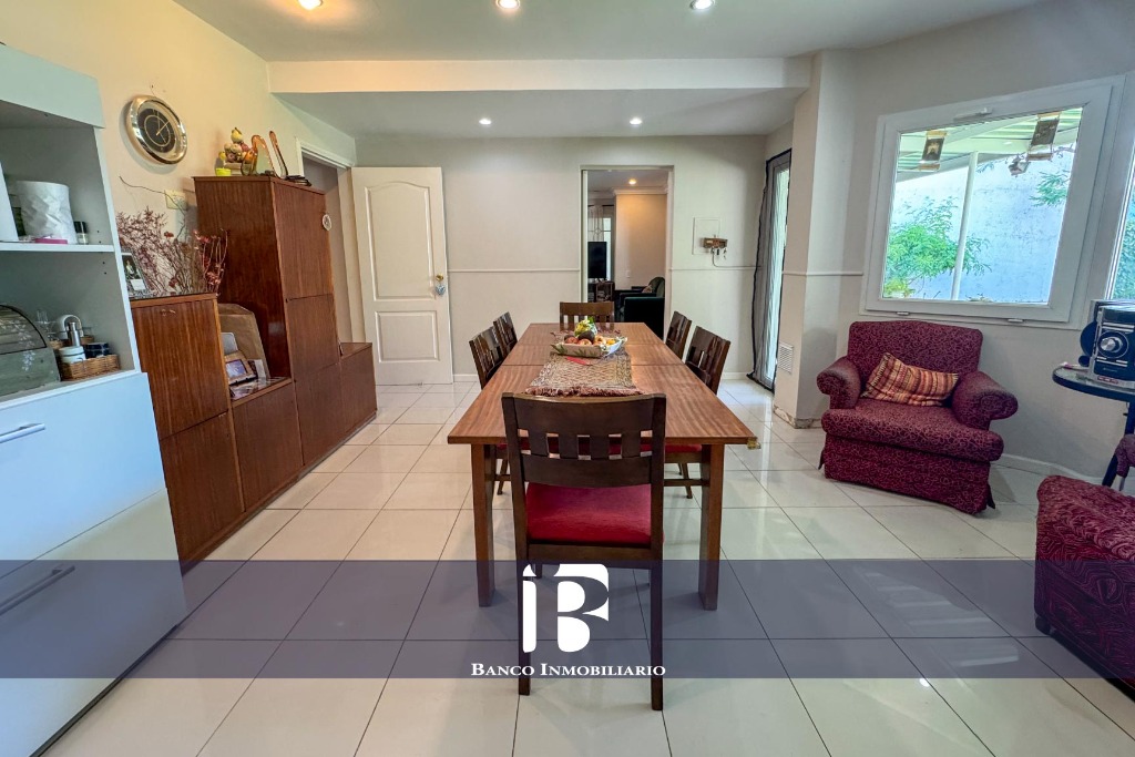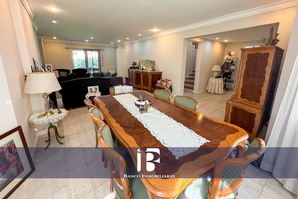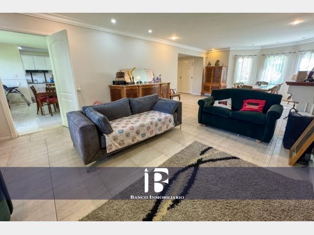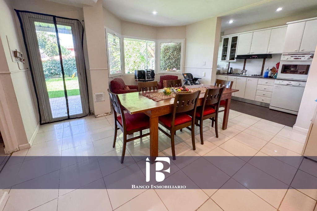Living - Comedor con hogar a leña, ambiente muy luminoso con ventanales hacia el jardín