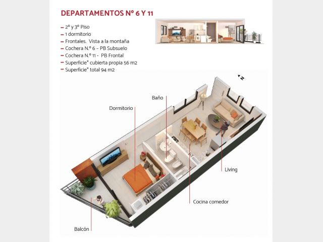? Excelente departamento ubicado en 2º Piso frontal por ascensor, muy luminoso y con mucha ventilación natural. DEPTO 6: Un Dormitorio, Cocina- Comedor, Baño y Cochera.