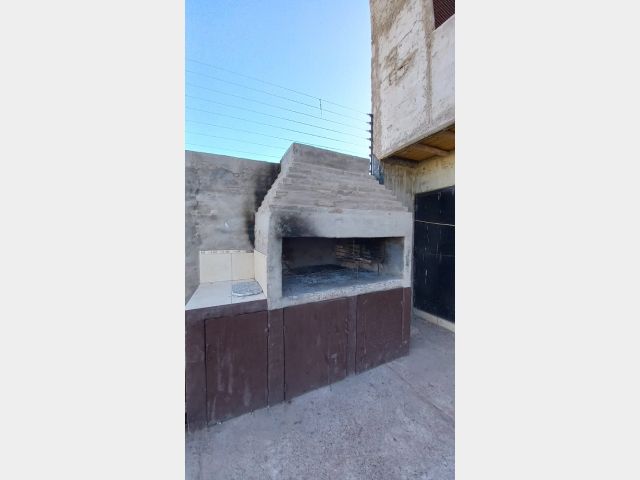 Jardín de ingreso con reja de seguridad, portón metálico que conecta a cochera descubierta con patio compartido y churrasquera.