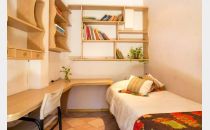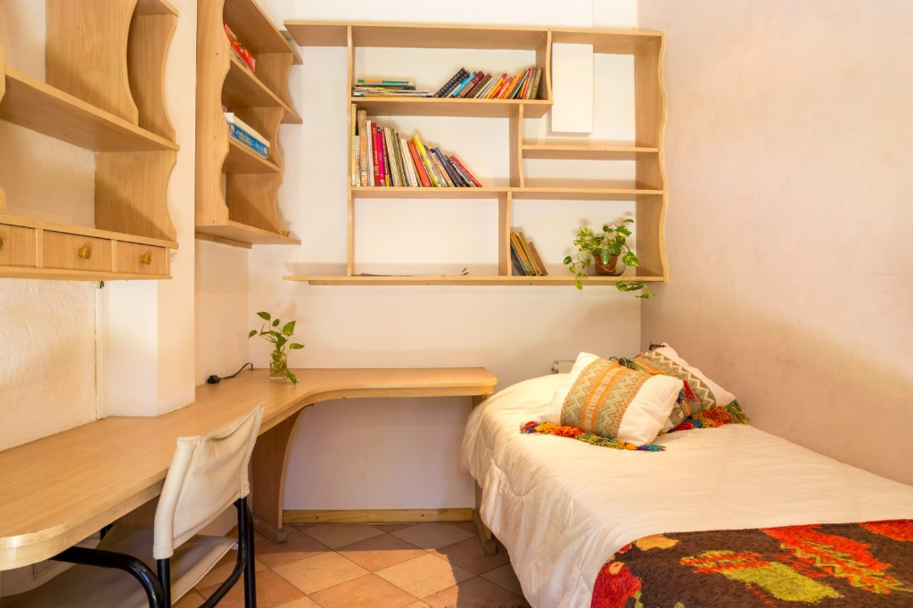 Al ingresar a la vivienda nos encontramos con un porche y la puerta de ingreso al living comedor amplio y una habitación para una persona con amplio mueble de estudio, empotrado en la pared.