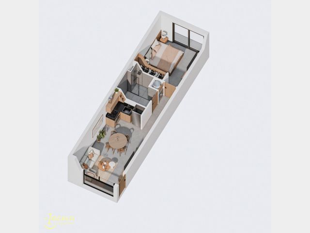 El proyecto consiste en un edificio de departamentos y cocheras dispuestos en un basamento de 4 niveles. El proyecto contempla 17 unidades habitacionales, las cuales se caracterizan por su gran amplitud y luminosos espacios generados a través de extensos paños vidriados de carpinterías. El complejo cuenta con con ascensor, cocheras, terraza con solárium y está habilitado para alquiler temporario, asegurando privacidad, confort y alta rentabilidad.
