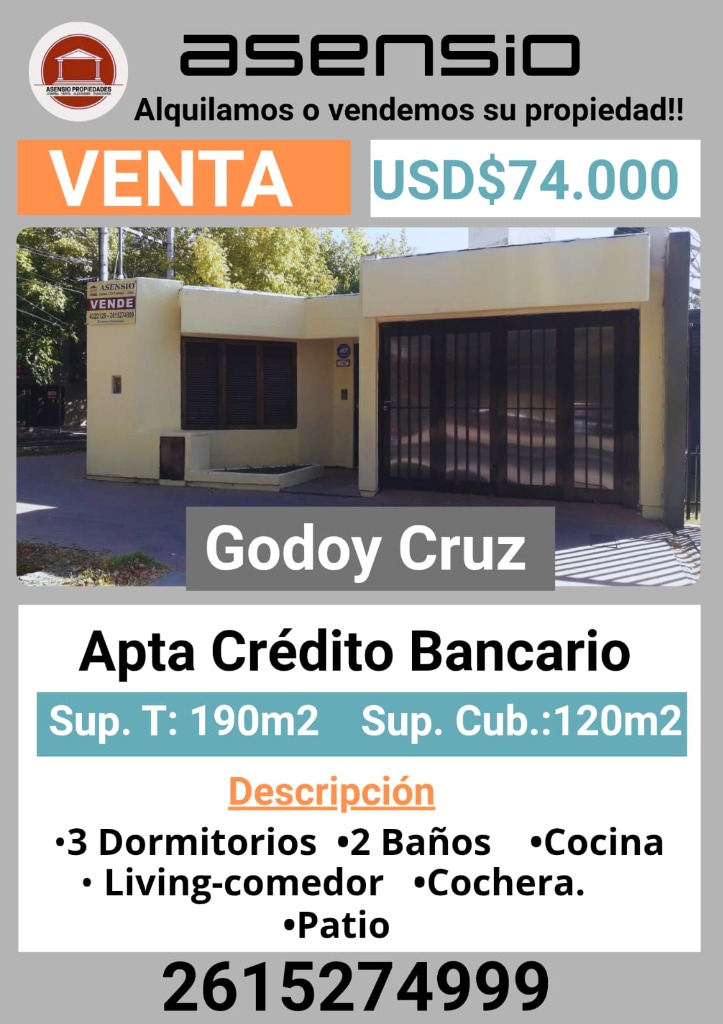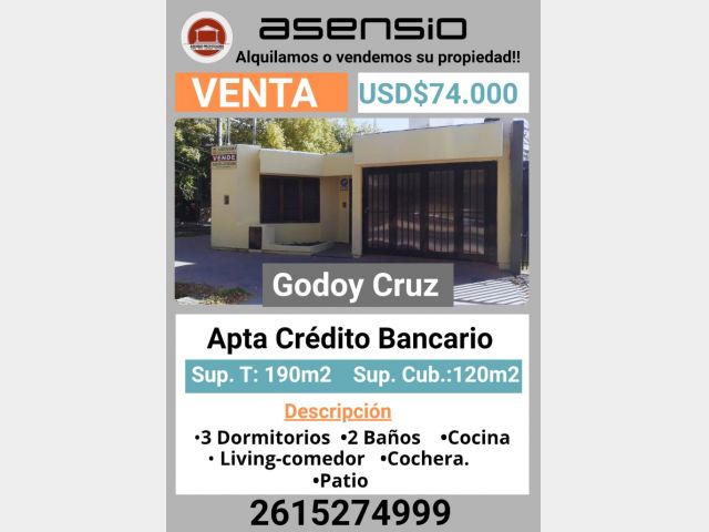 En esta oportunidad, te presentamos una hermosa casa en venta en la zona céntrica de Godoy Cruz, a tan solo unos pasos de la Plaza Godoy Cruz. Esta propiedad cuenta con 3 dormitorios, 2 baños,cocina, living -comedor, patio y cochera.