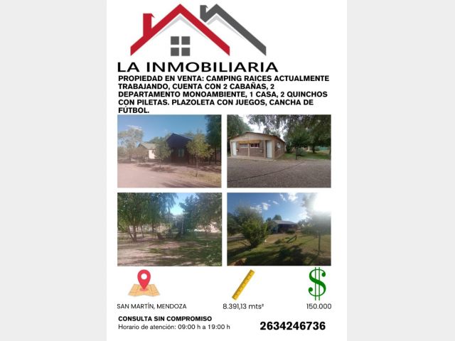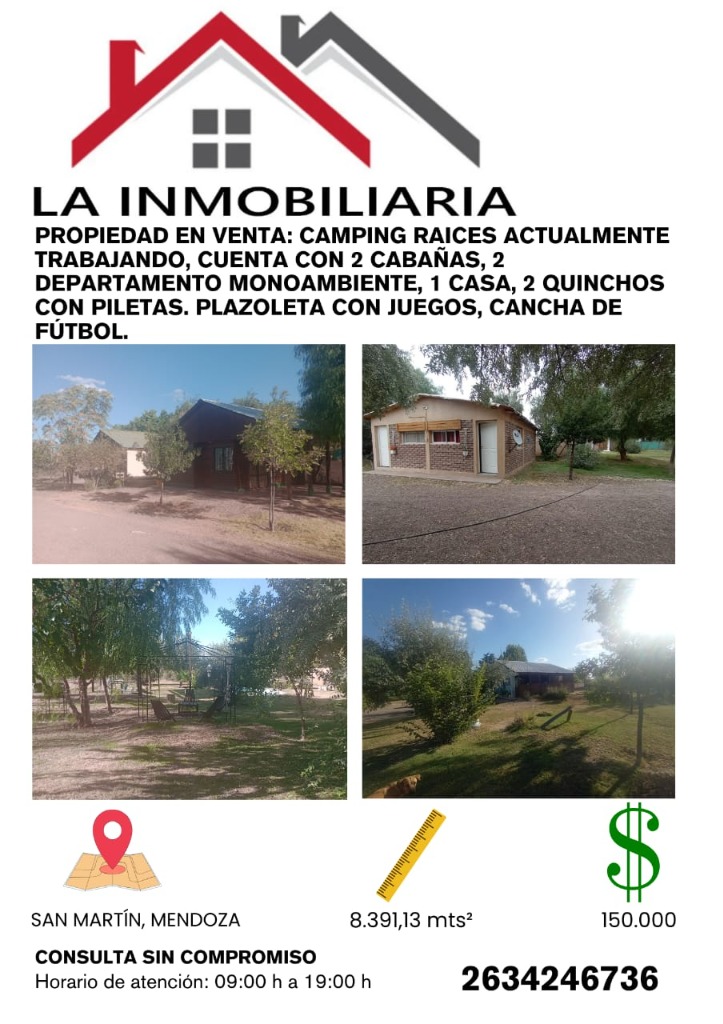 LA INMOBILIARIA VENDE: CAMPING RAICES ubicado en carril Norte, San Martín, Mendoza. actualmente trabajando, cuenta con su respectiva cartera de clientes. cuenta con 2 cabañas de 34 mts cada una amueblada. 2 departamento monoambiente de 28 mts cada uno. 1 casa de 52 mts. 2 quinchos con baños. 2 piletas. Plaza de juego. Cancha de fútbol. Hermoso parquizado con plantas, árboles y frutales. Cierre con tela rombo ideal, cerco eléctrico. Valor USD 150.000 consulta al 0263 15-424-6736
