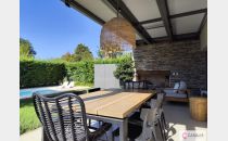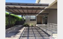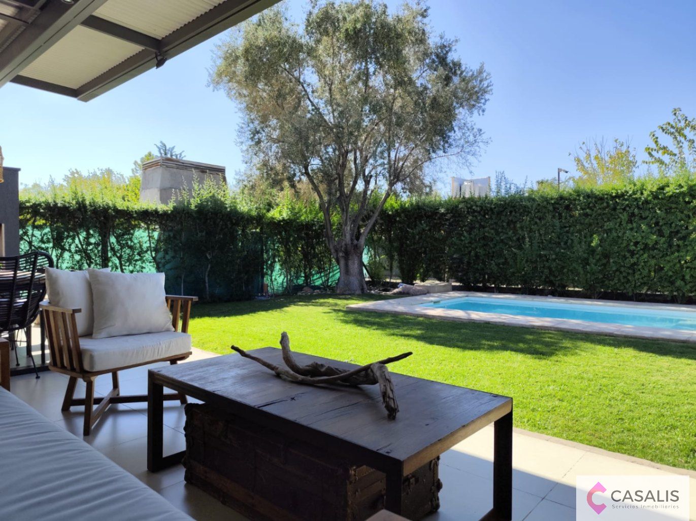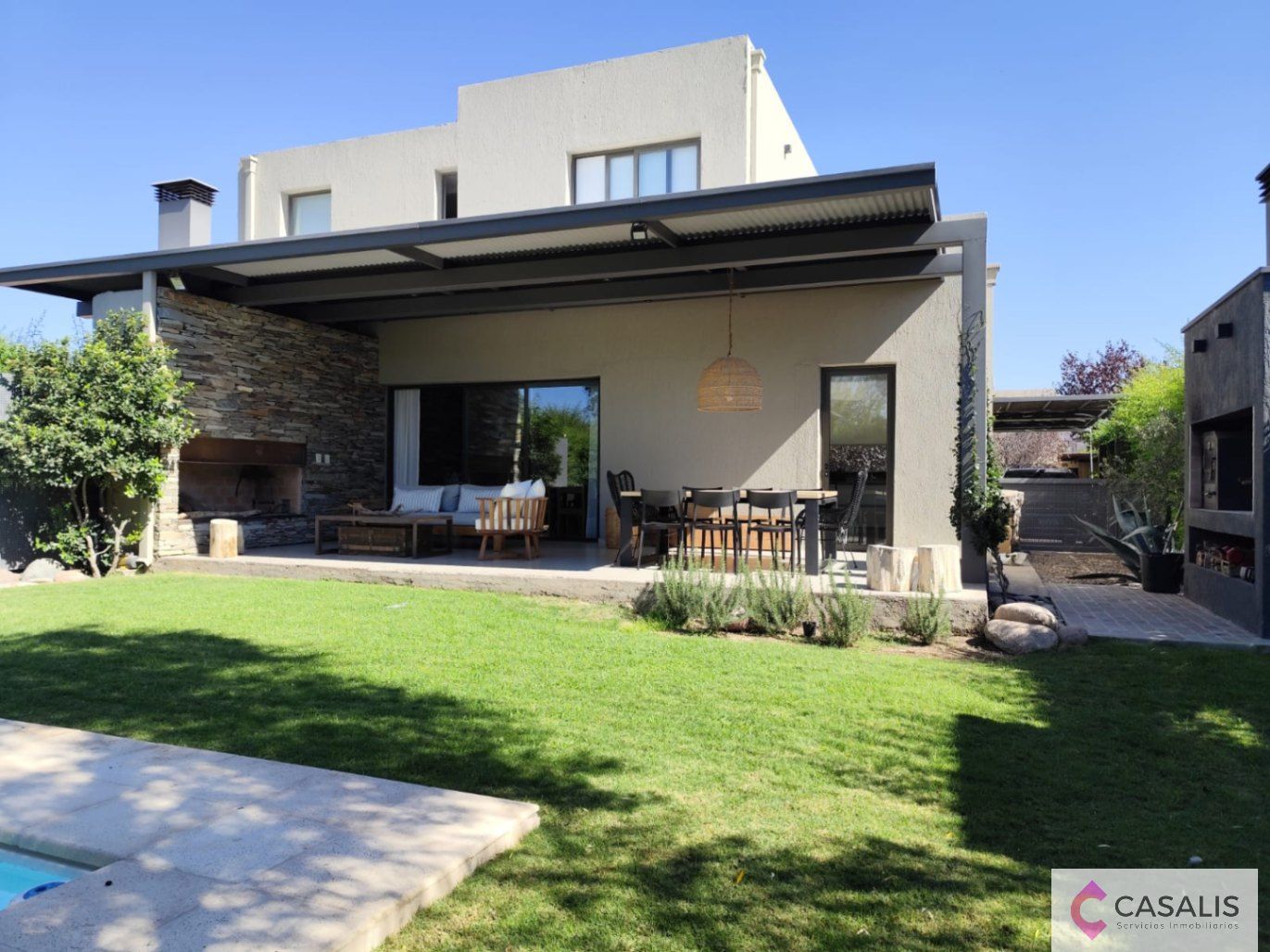 Sector de galería con churrasquera, patio y piscina.