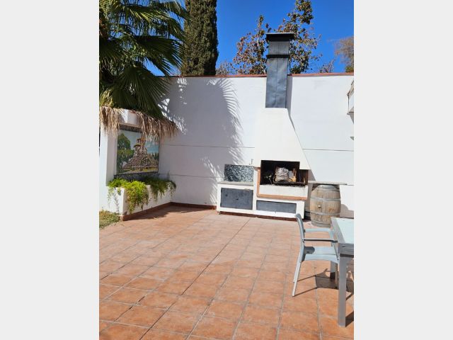 Posee patio con parrilla y pileta de material.