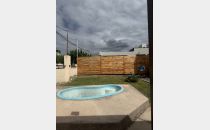 Exterior Privado: Patio parquizado con piscina y churrasquera.