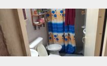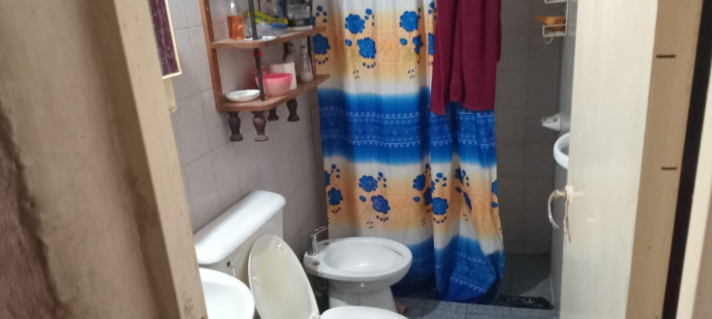 * Baño completo con pisos y revestimientos cerámicos, receptáculo de ducha, sanitarios blancos y lavatorio. Cielorraso con detalles a refaccionar.