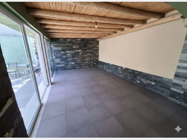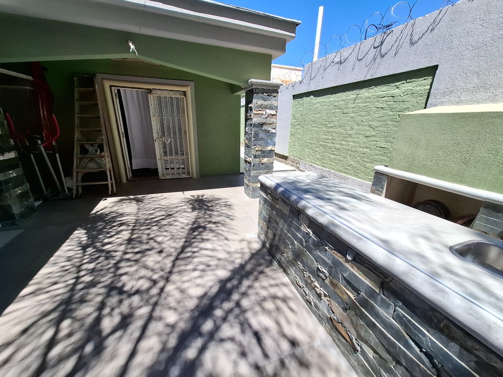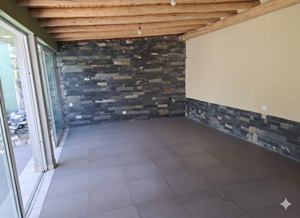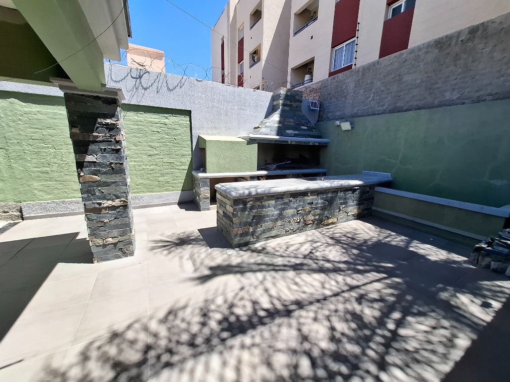 Tiene patio embaldosado y churrasquera con mesada y bacha de lavado.
