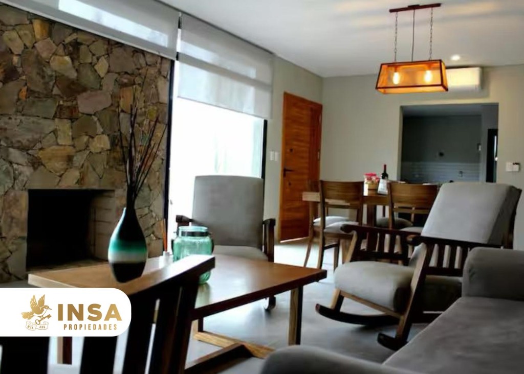 Amplio living comedor con ventanales DVH y hogar a leña.