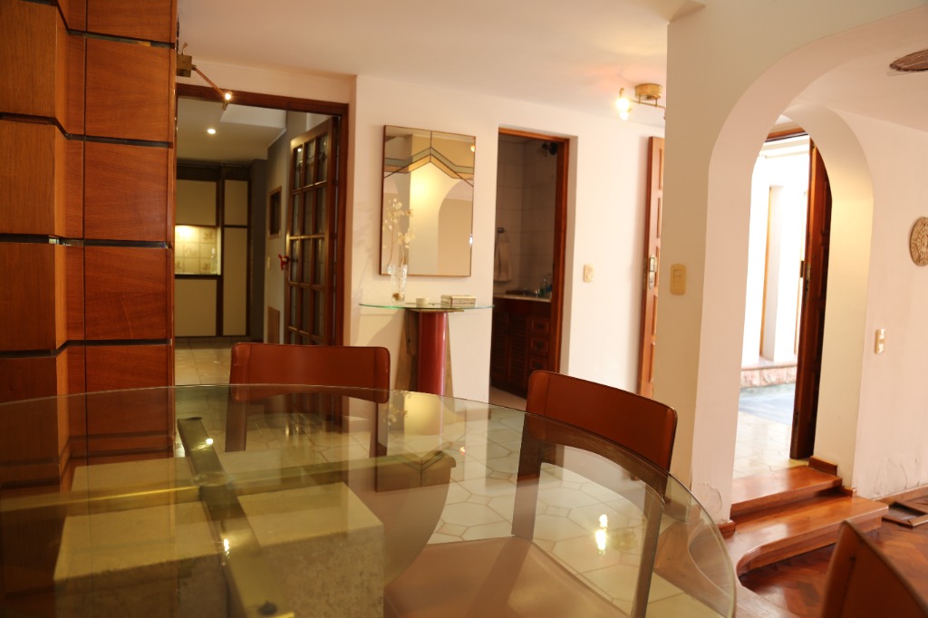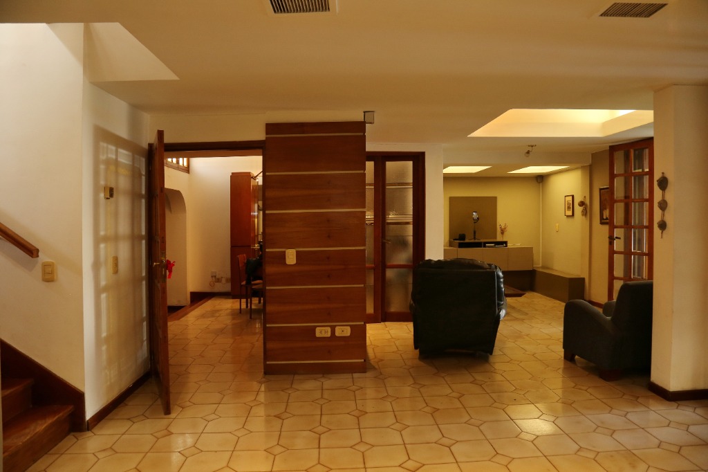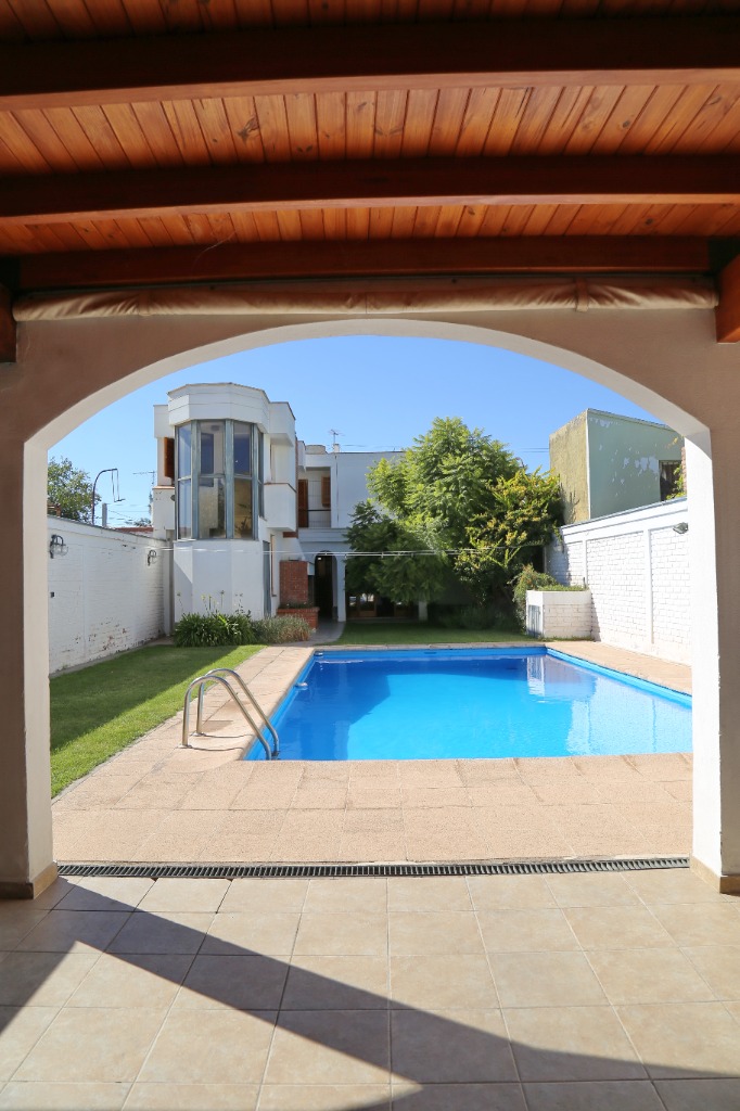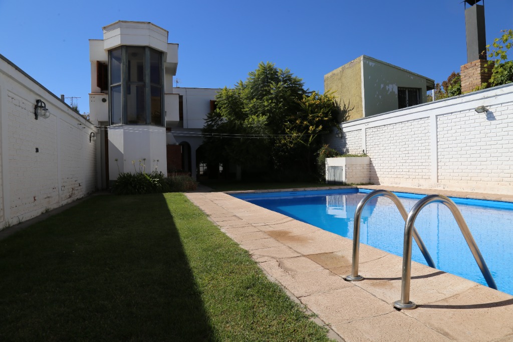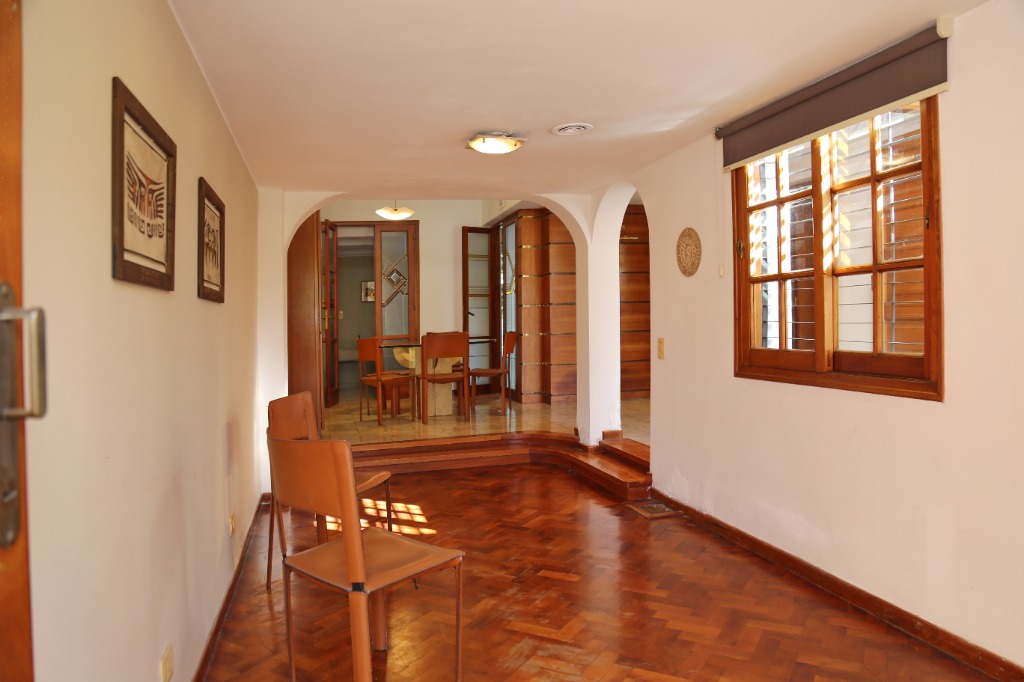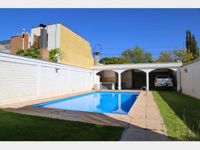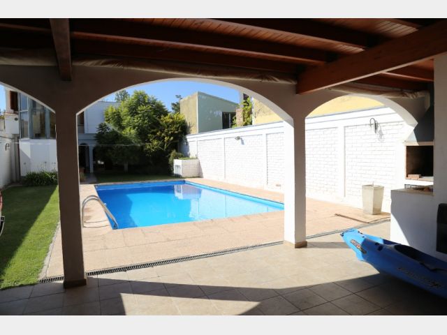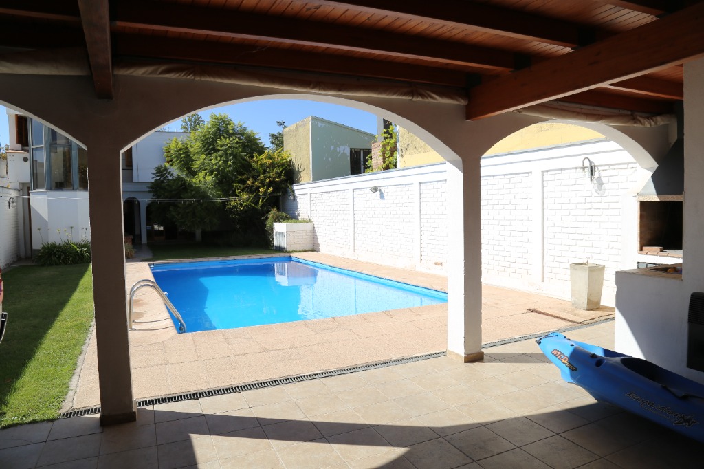 Planta baja: amplio living-comedor, sala de estudio integrada, cocina, lavandería, baño completo y cochera para 4 vehículos. Jardín parquizado con piscina y churrasquera.