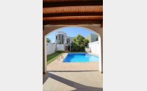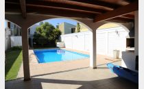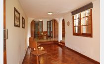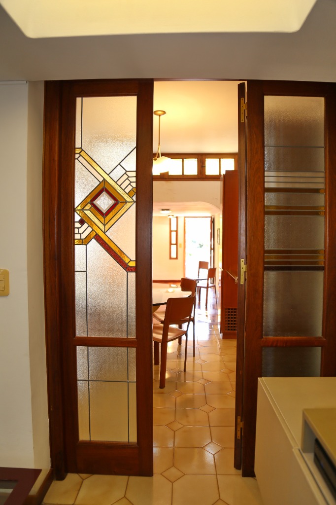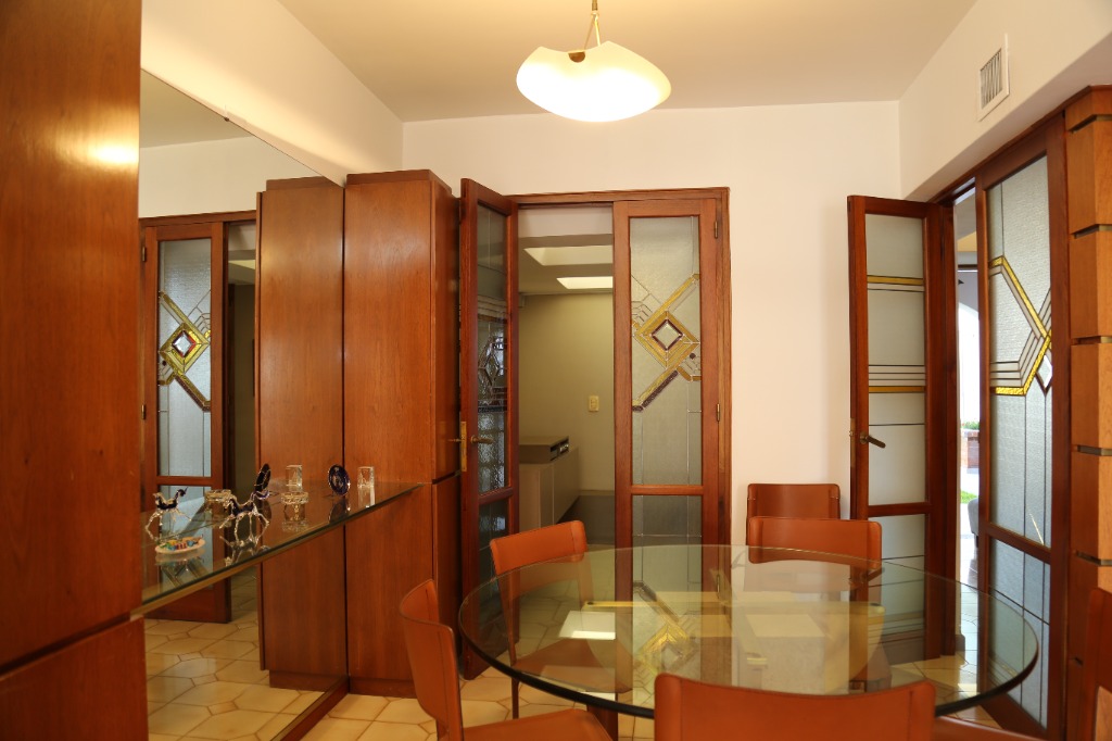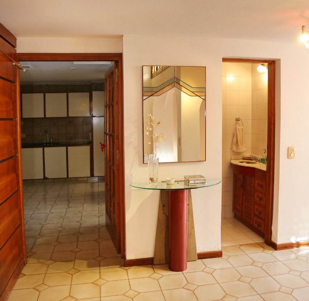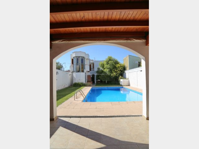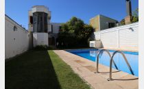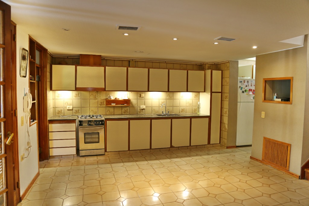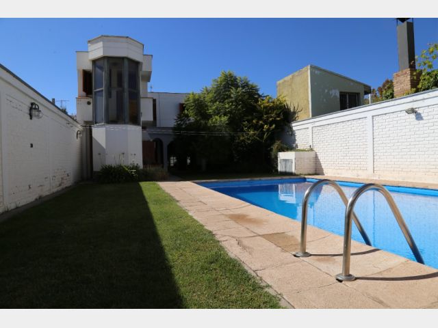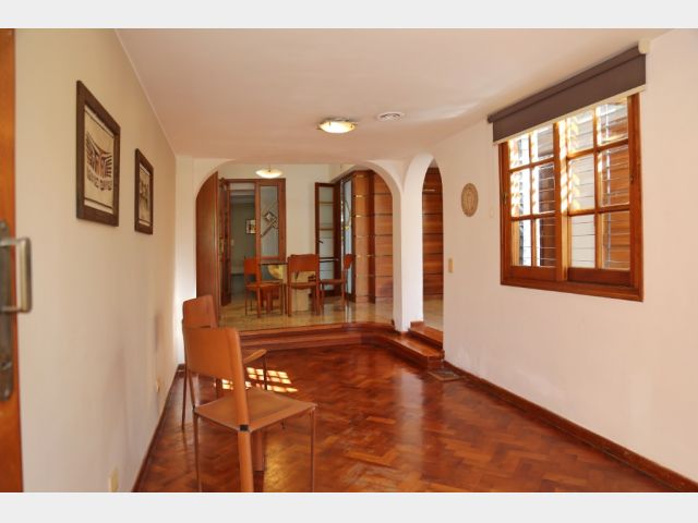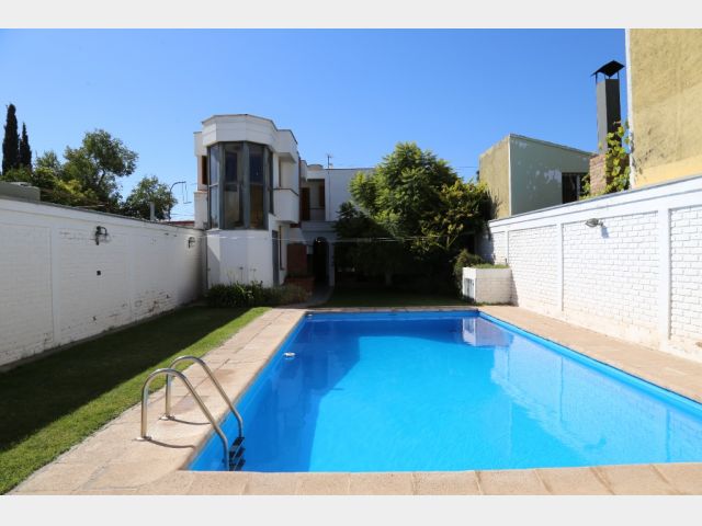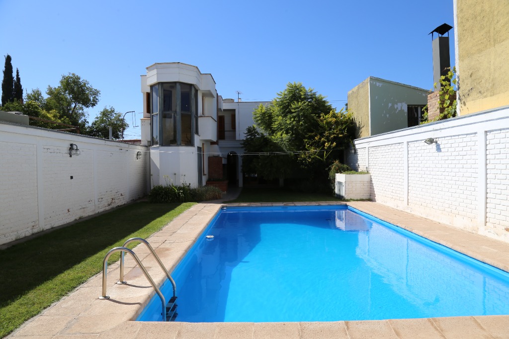 Planta baja: amplio living-comedor, sala de estudio integrada, cocina, lavandería, baño completo y cochera para 4 vehículos. Jardín parquizado con piscina y churrasquera.