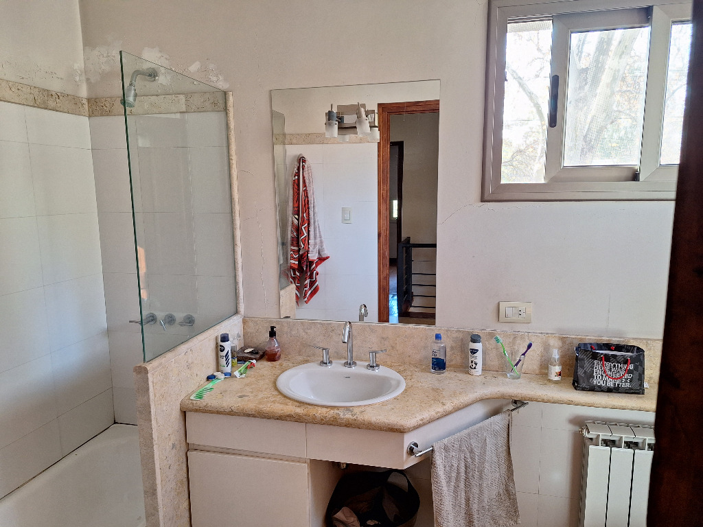 En planta baja tiene: un gran living, comedor con vista al jardín, baño, cocina comedor con alacenas modernas de excelente calidad. Piscina grande con bomba y filtro, jardín con riego por aspersión y árboles, parrilla con muy buen tiraje. En el sector sur tiene quincho, lavandería, un dormitorio y un baño.