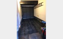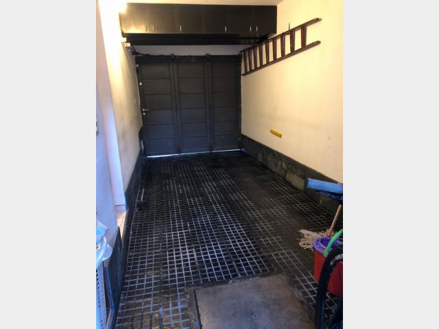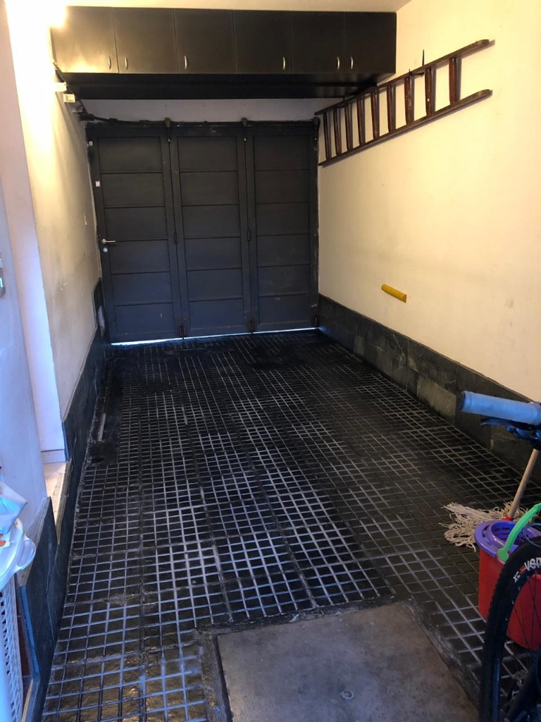 ° cochera para un vehículo con portón metálico corredizo y mueble de guardado