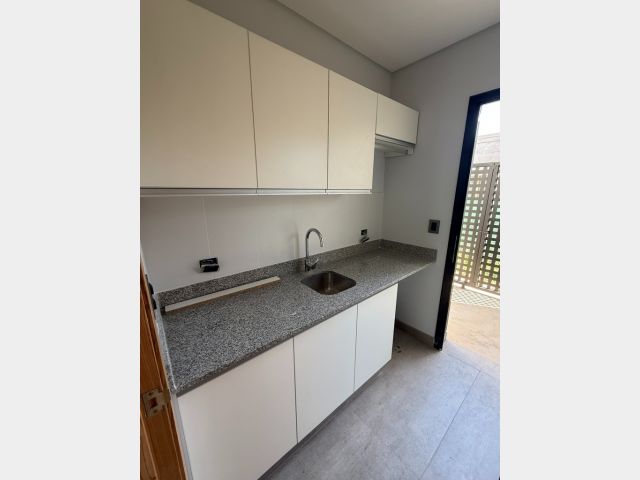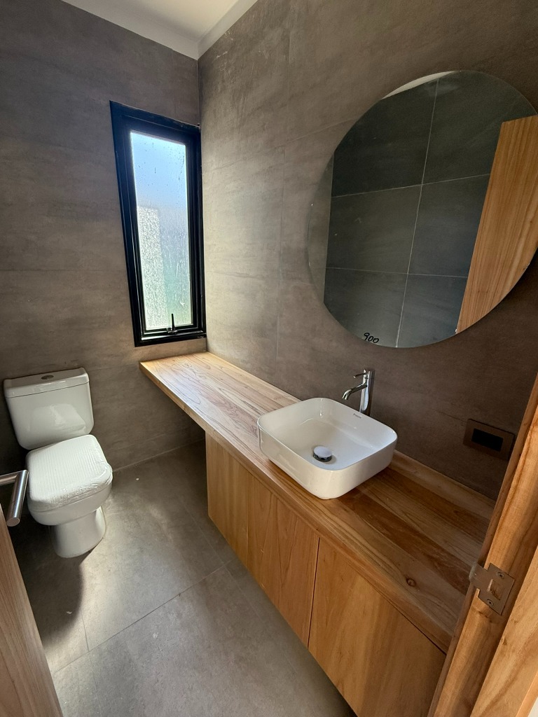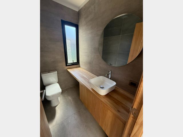 La casa cuenta con cocina independiente, totalmente equipada, con isla, horno empotrado, anafe, campana y muebles de diseño, pensada para combinar funcionalidad y estética. Además, posee toilette de visitas.