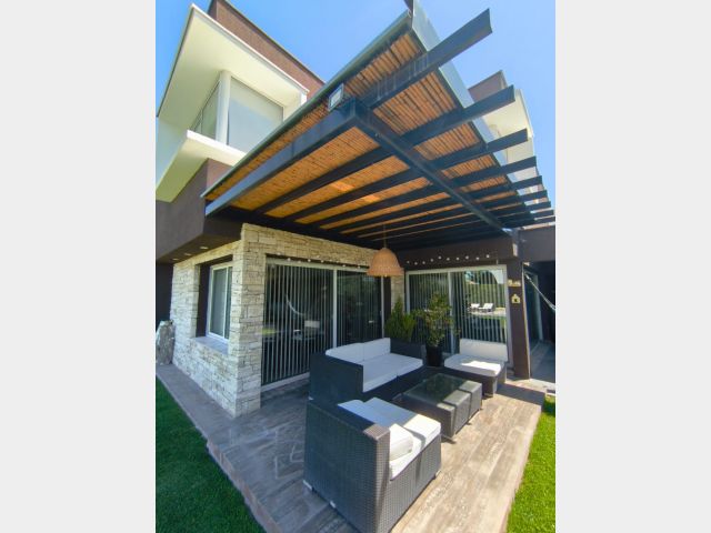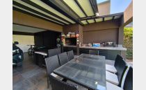 En el exterior de la casa contamos con: sector de churrasquera completo con techo movedizo eléctrico; un baño exterior; piscina de 3m x 7m con sensores de encendido y apagado automático; jardín parquizado; y cochera con portón automático con capacidad para cuatro vehículos.