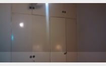 Ventanales de aluminio esmaltado y puertas de madera.