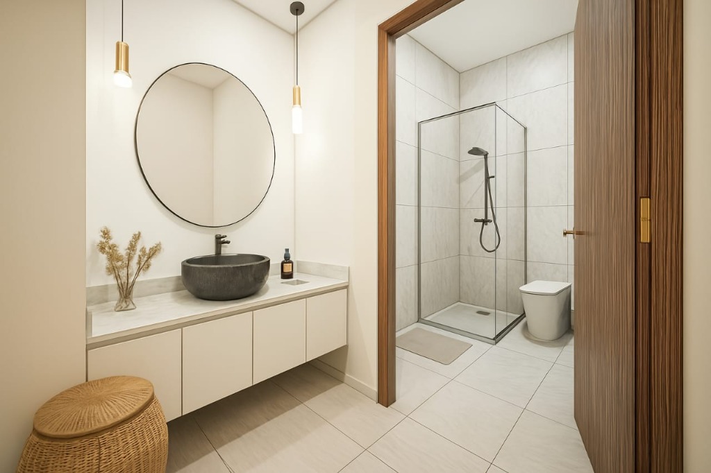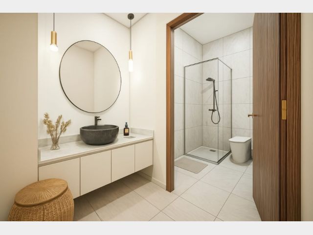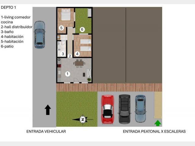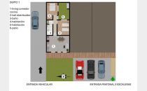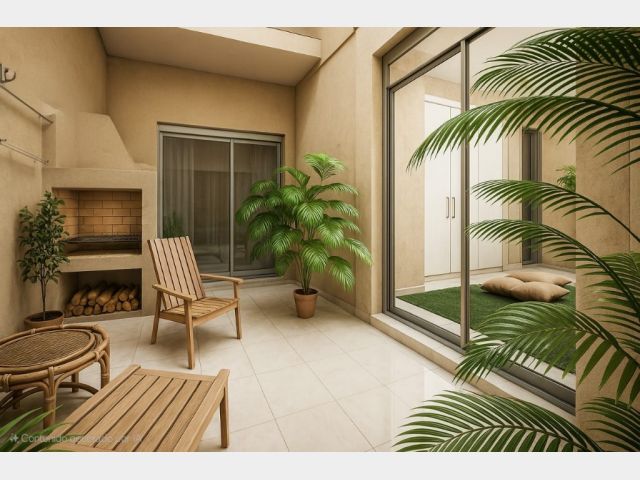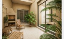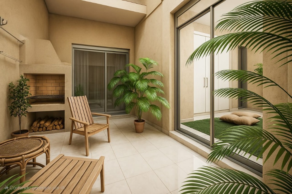 Hall distribuidor, antebaño y baño completo con ducha. Dos dormitorios. Patio con churrasquera. Carpintería de aluminio y pisos de porcelanato.
