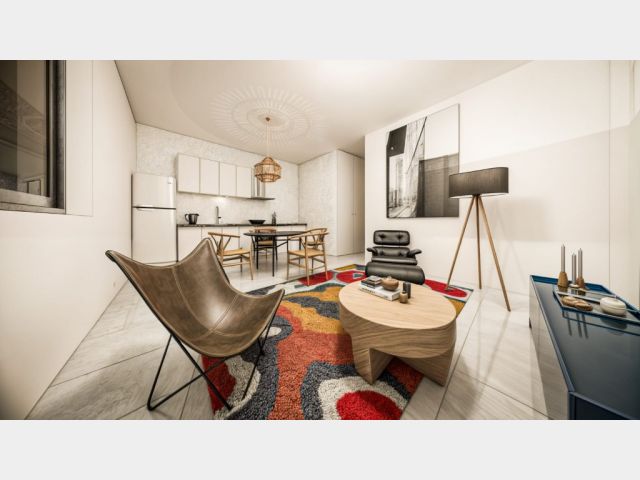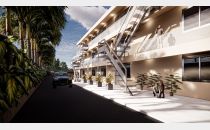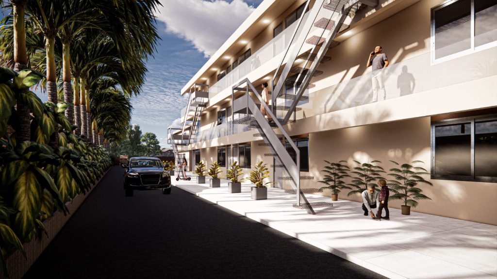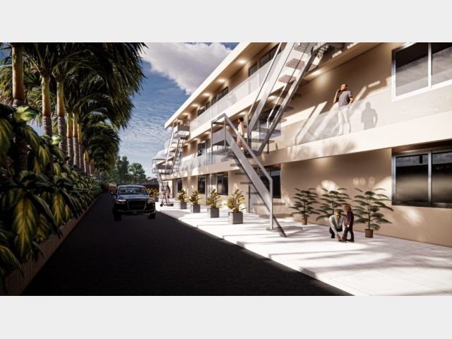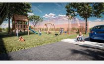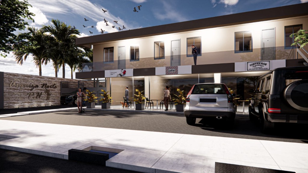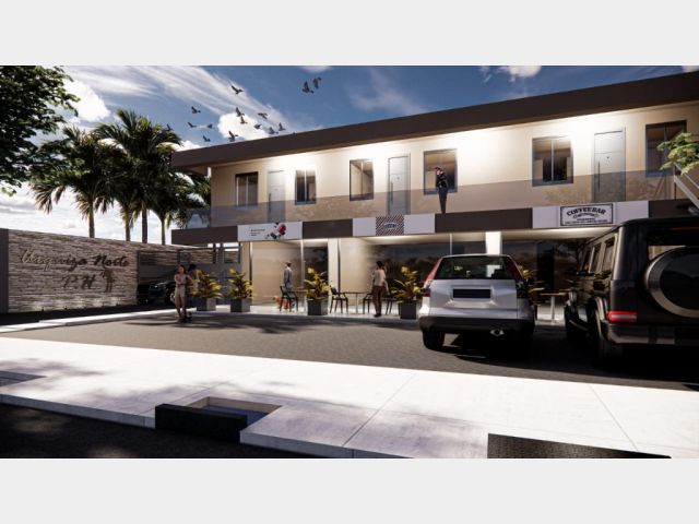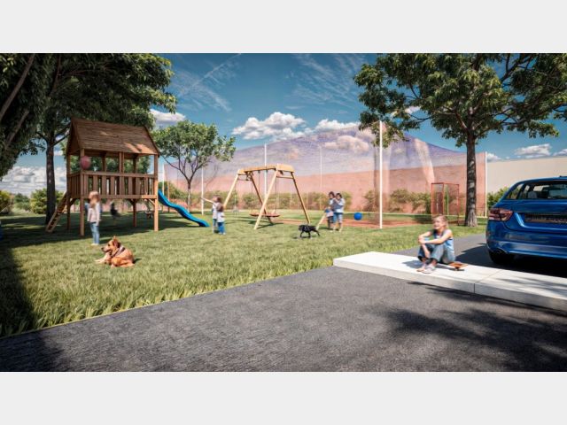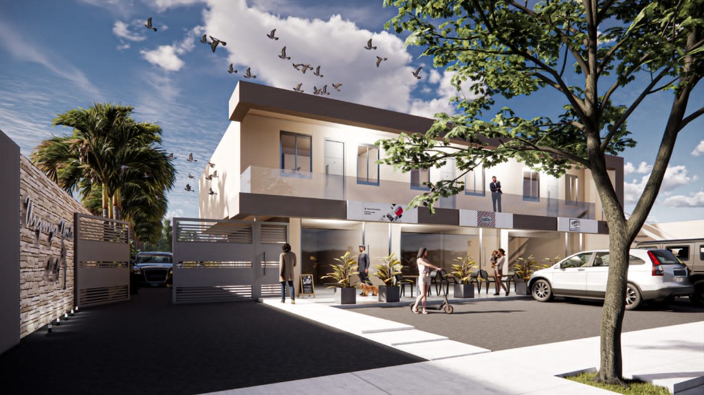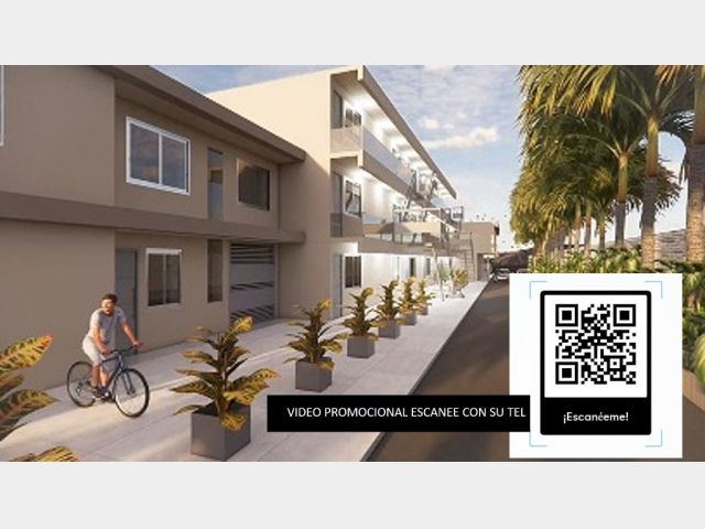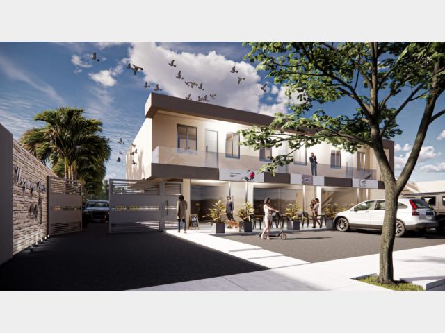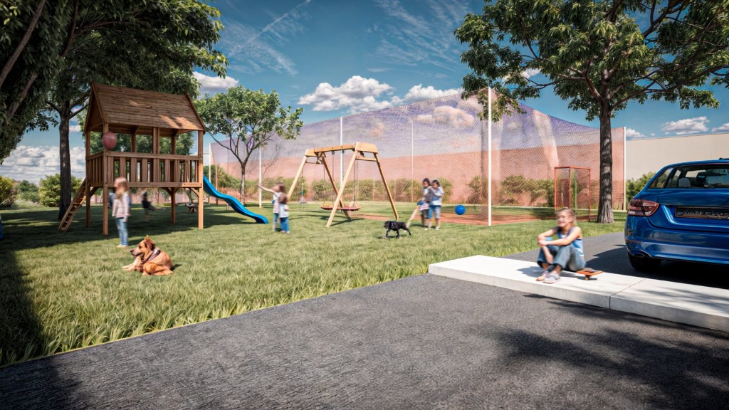 El complejo contará además con tres locales comerciales frentistas en planta baja, cocheras internas techadas con portón automatizado y patio de juegos y cancha de fútbol con cerco perimetral.