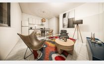 Cocina, living, comedor con diseño de concepto abierto (se entrega con cocina equipada con mobiliario de mesada, alacena y termotanque).