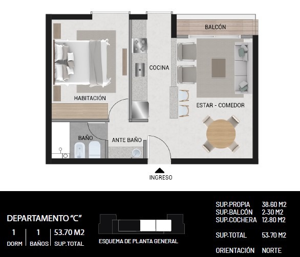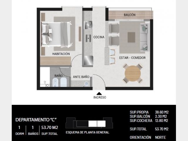 Sup. Cubierta con cochera incluída, 53,70 m2.
