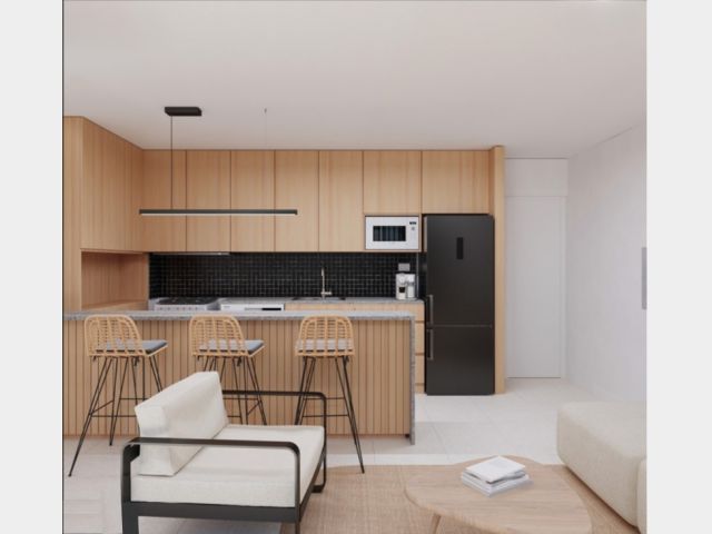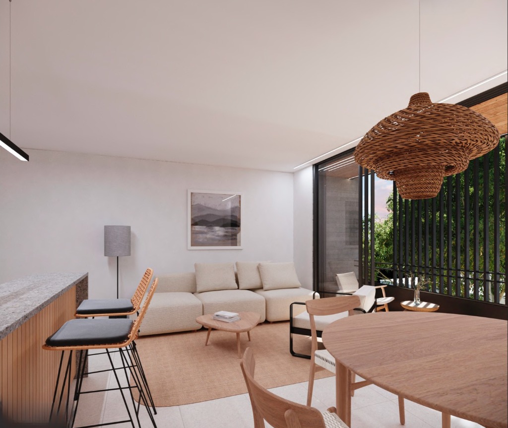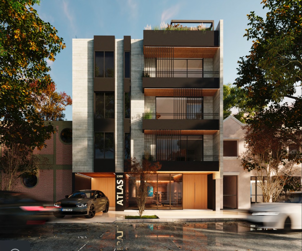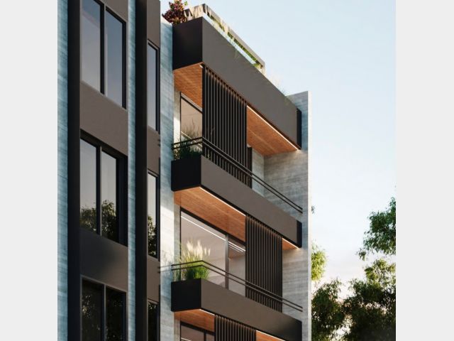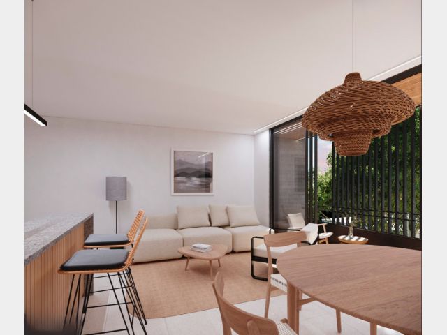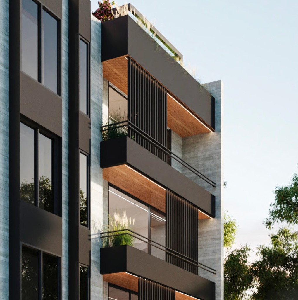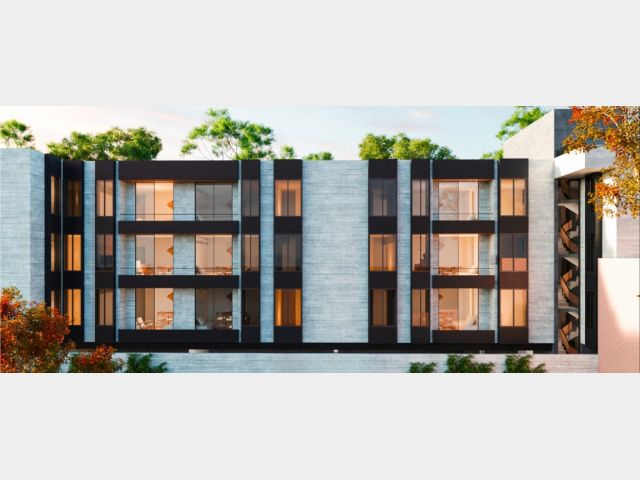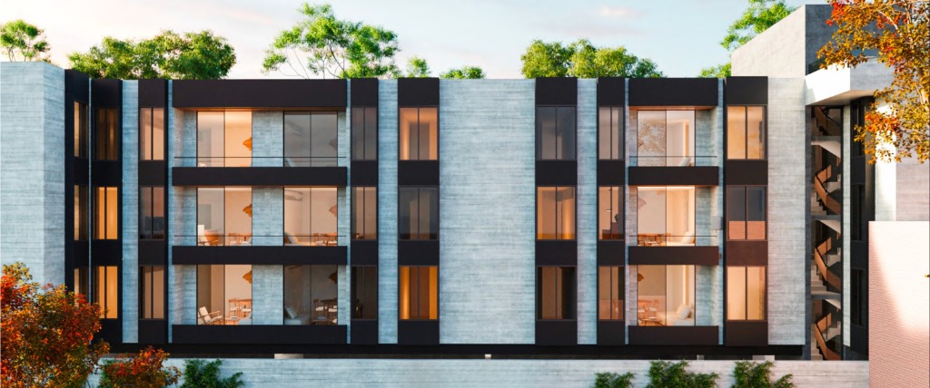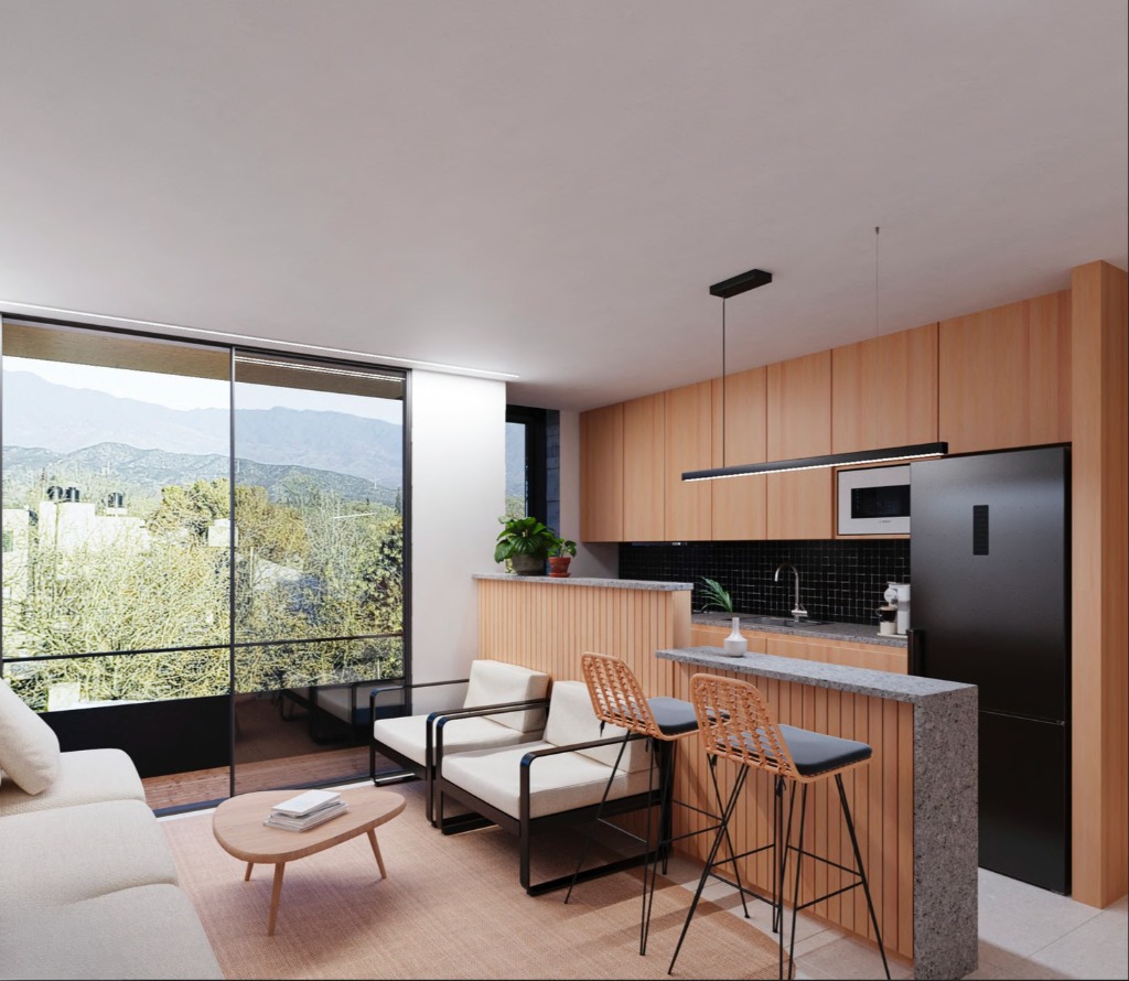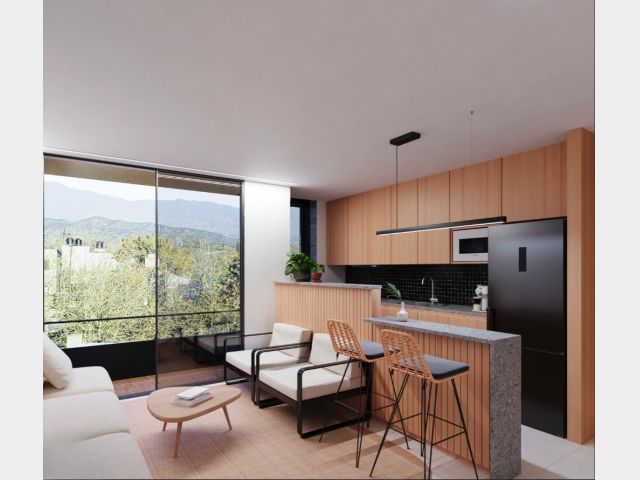 Este complejo está compuesto por 15 departamentos desarrollados con materiales de aluminio, hormigón y madera, los cuales le dan a los espacios una mezcla de calidéz y modernidad funcional.
