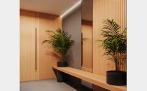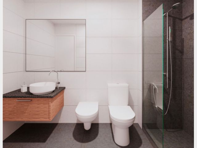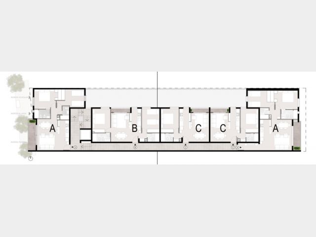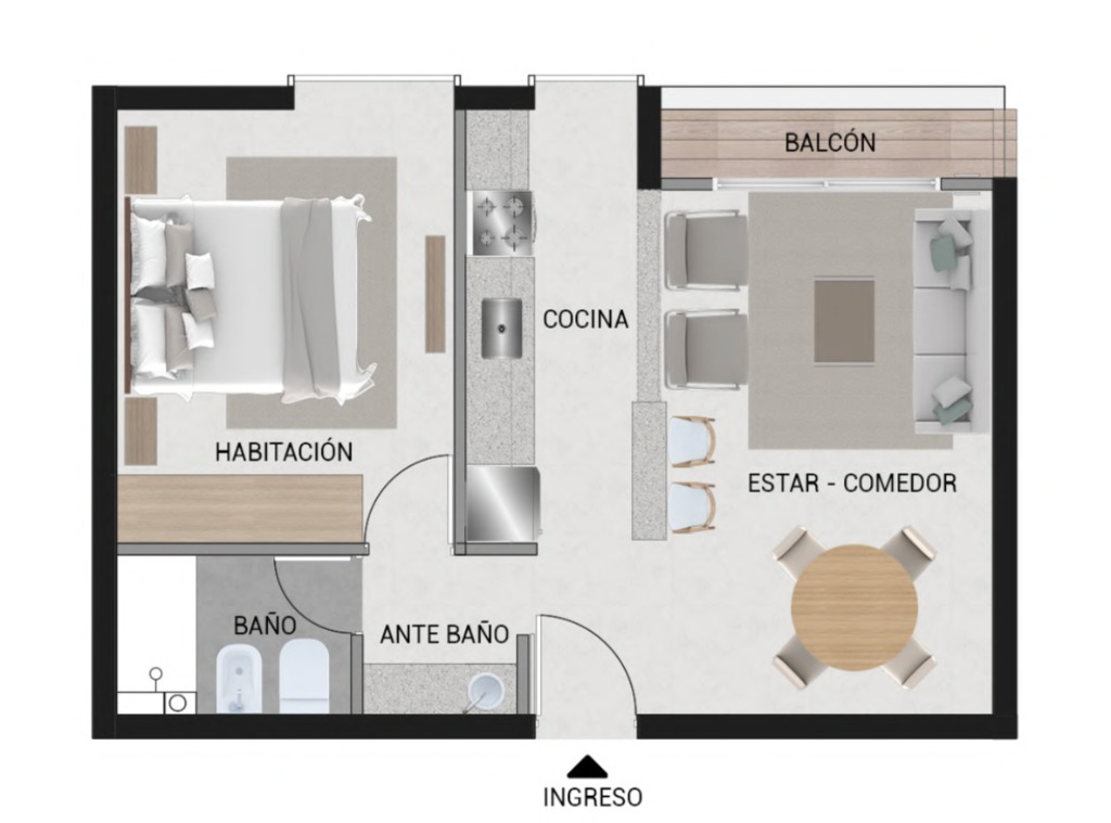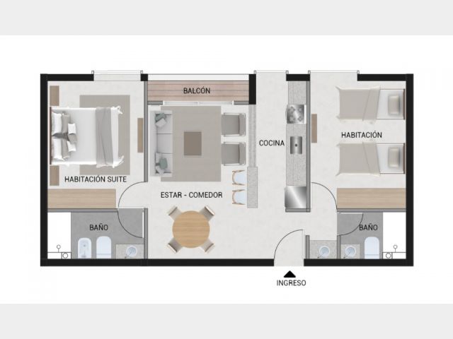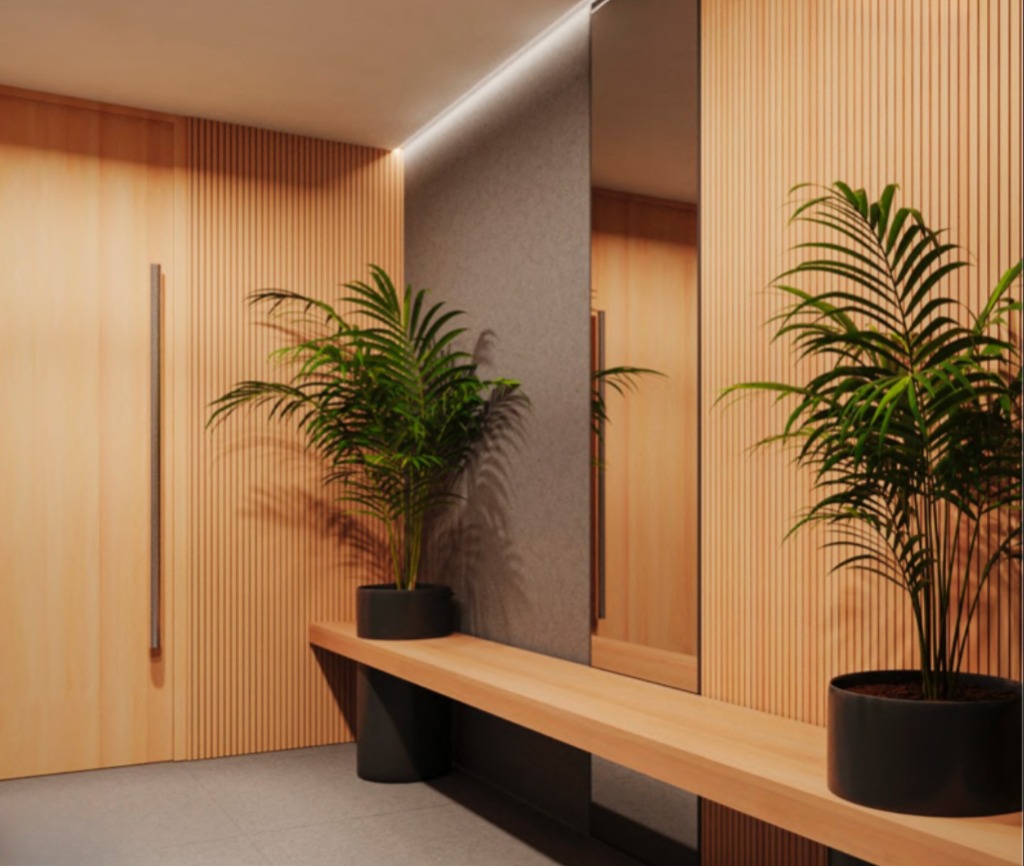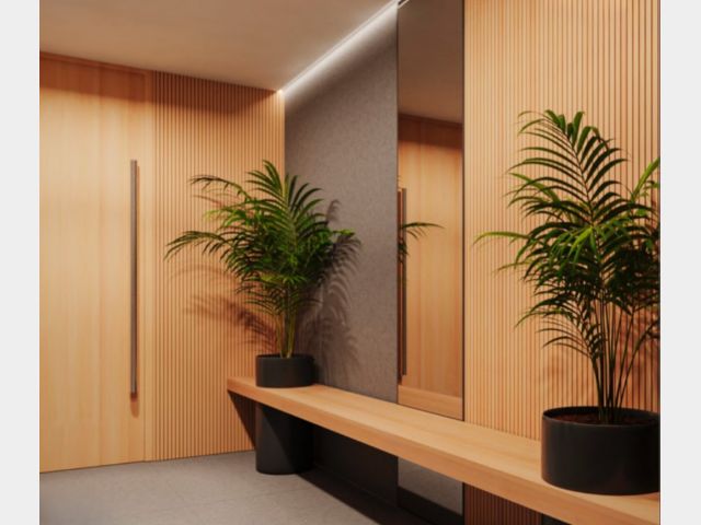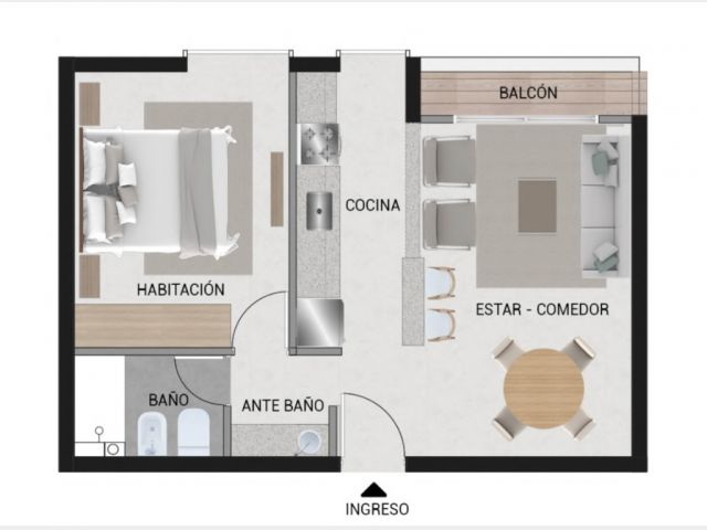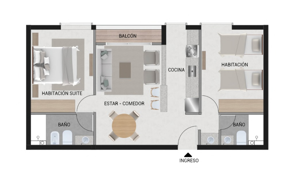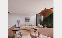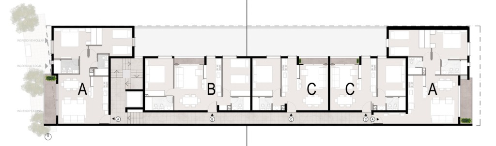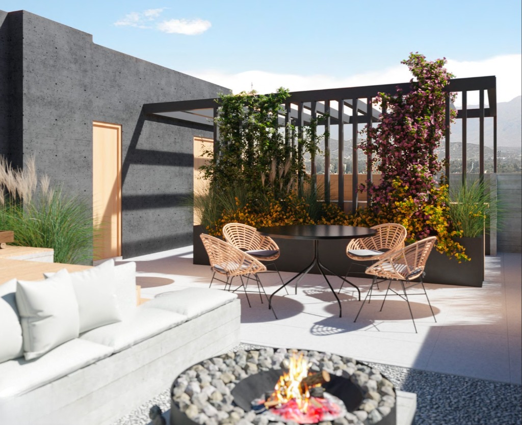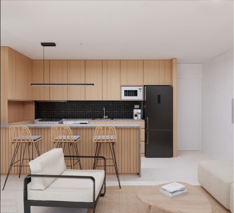 Este complejo está compuesto por 15 departamentos desarrollados con materiales de aluminio, hormigón y madera, los cuales le dan a los espacios una mezcla de calidéz y modernidad funcional.
