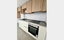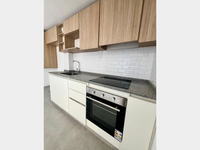 Cocina integrada con muebles de melamina y mesada de granito