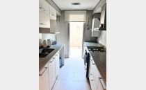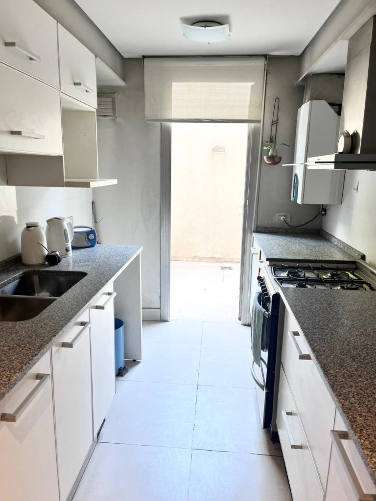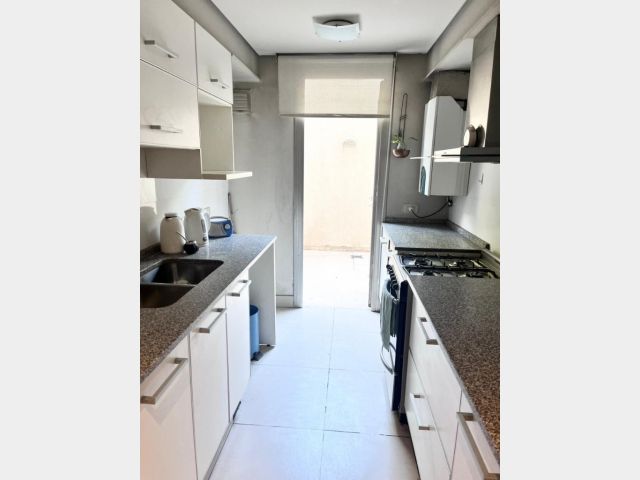 Al ingresar, nos recibirá un luminoso living comedor, seguido de una cocina con lavadero integrado. El departamento cuenta con dos dormitorios, uno de ellos en suite con baño completo. Además, hay otro baño completo para uso general. Los pisos de porcelanato de primera calidad y las aberturas de aluminio brindan un ambiente moderno y elegante.