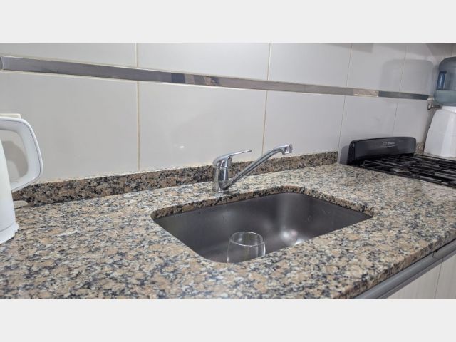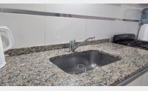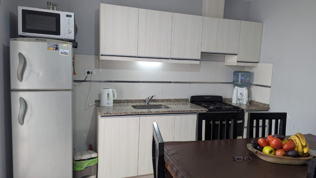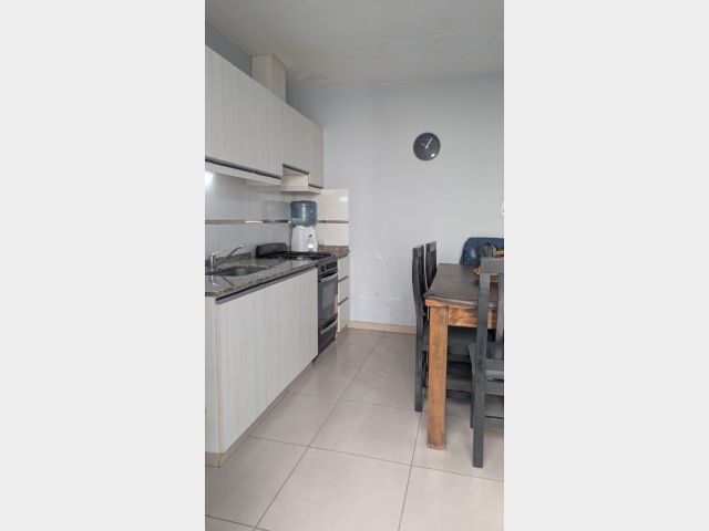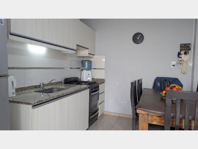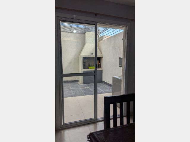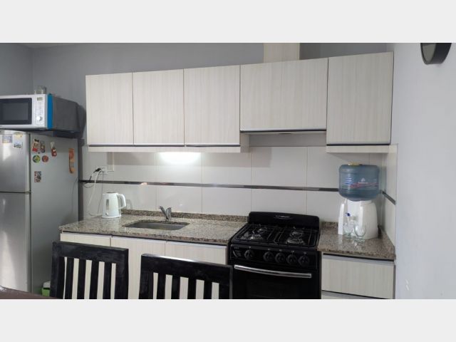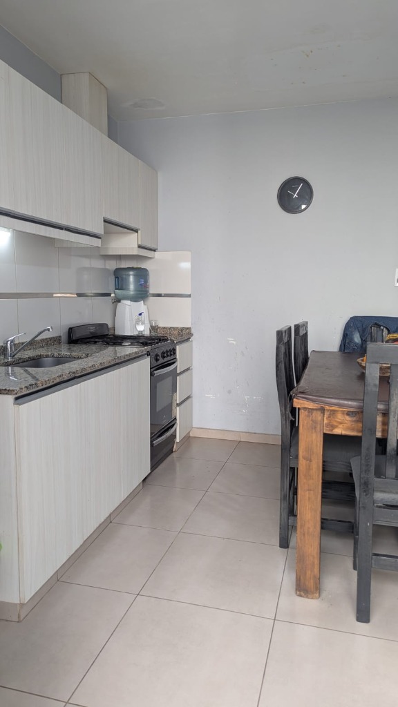 Living comedor, cocina comedor con salida al patio, el cual cuenta con churrasquera, con mueble de guardado y leonera.