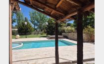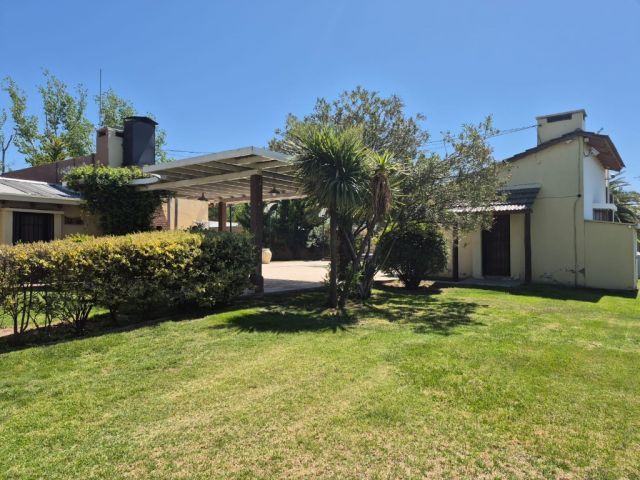 Vivienda principal: cocina comedor, baño completo, amplio living con piso entablonado, dormitorio principal y gran espacio semicubierto tipo pérgola con churrasquera.