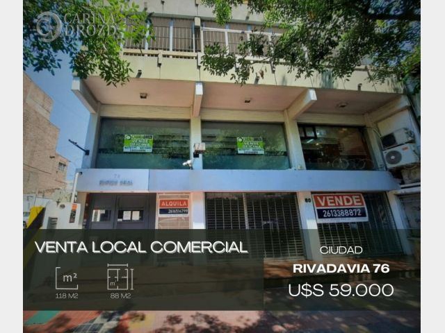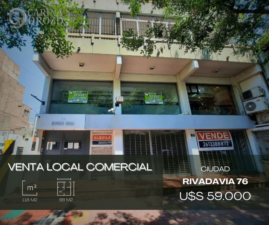 “CARINA DROZD gestiones inmobiliarias” VENDE: EXCELENTE LOCAL COMERCIAL CÉNTRICO!!": Calle RIVADAVIA 76, entre Avda. Gral. San Martín y calle 9 de Julio. Piso 1. ASCENSORES. FRONTAL! a calle Rivadavia. Muy luminoso!! Amplios ventanales. SUPERFICIE: 88 m2 cubiertos propios. Consta de una amplia RECEPCION- SALA DE ESPERA- 5 PRIVADOS separados por módulos de vidrios. COCINA con amoblamientos, heladera frigobar y anafe de dos hornallas para gas de garrafa. Un BAÑO Completo. Pisos Suspendidos. Alarma. Todas las luminarias colocadas (dicroicas y apliques). Equipo de A.A. Ventilador de techo. Alquilado hasta Febrero 2026. VALOR: U$S 59.000. Escucho OFERTAS por pago contado. Financiación propia a conversar. Recibo Vehículo en parte de pago. ESCRITURACION Inmediata.