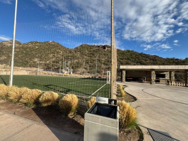 Cancha de fútbol con quincho con churrasquera.