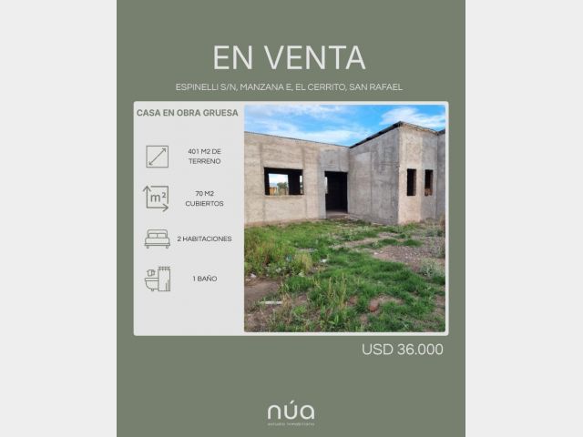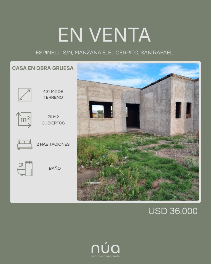 Casa en obra gruesa tradicional ubicada en el loteo Altos del Cerrito, un entorno residencial en crecimiento, a solo 8 km del centro de San Rafael, con excelente acceso y tranquilidad permanente.