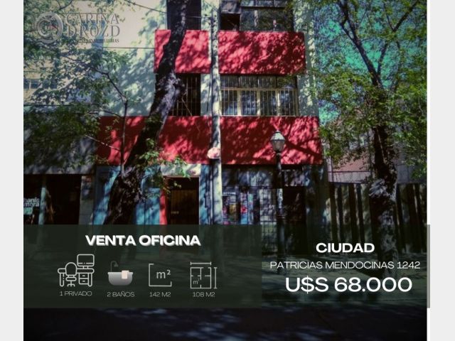 “CARINA DROZD gestiones inmobiliarias” VENDE: Excelente OFICINA en CIUDAD: calle PATRICIAS MENDOCINAS 1242, entre Calles Espejo y Gutiérrez. Edificio "MARTIN- MORA". La Oficina ocupa todo el Primer Piso. FRONTAL! Muy luminosa!! ASCENSOR. SUPERFICIE: 142 m2 Cubiertos Totales- 108 m2 Cubiertos Propios + Superficie Cubierta Común de Uso Exclusivo Azotea 11 m2. Consta de: AMPLIO SALON pisos laminados, símil flotante madera- 1 PRIVADO/ OFICINA entrada independiente, con placard con bauleras- 2 BAÑOS completos - 1 COCINA con muebles alacenas, bajo mesada, mesada de acero inoxidable y bacha- 2 Equipos de Aire Acondicionado. Luminarias colocadas. Todos los ventanales con rejas. Recién pintada. VALOR: U$S 68.000 - ALQUILADA hasta Noviembre 2026, con excelente renta. ESCRITURACION INMEDIATA. Financiación Propia a conversar.