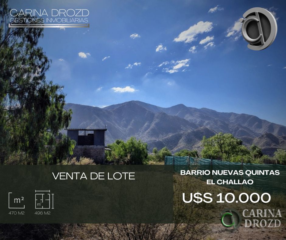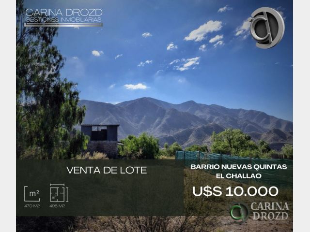 "CARINA DROZD gestiones inmobiliarias" VENDE: LOTE EN BARRIO PRIVADO "NUEVAS QUINTAS": AVDA. CHAMPAGNAT sin n°, El Challao, frente al Mirador, en zona de importante crecimiento habitacional y comercial, cerca del Restaurant "Isidris", del complejo "Puesto del Indio", con barrios privados cercanos de jerarquía. El barrio cuenta con: Garita de VIGILANCIA 24 horas- Cámaras. SERVICIOS: luz- gas- próximamente aguas. Mzna "B". Ubicadísimo! Sobre la calle Principal de subida, a 200 mts de la Garita. SUPERFICIE: 470 m2- SIMETRICO (15 m de Frente y de Fondo). PERIMETRO CERRADO con alambrado perimetral y tela verde. Limpio. Inmejorables VISTAS a las montañas. ESCRITURACION INMEDIATA (en condominio). VALOR: U$S 10.000. FINANCIACION Propia, abonando un 80% de contado. Expensas: $ 45.000