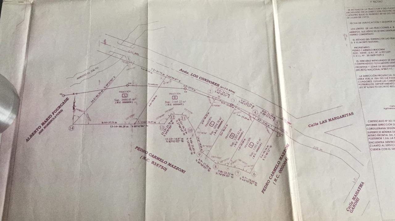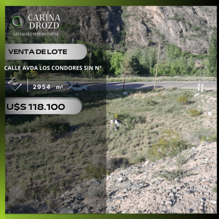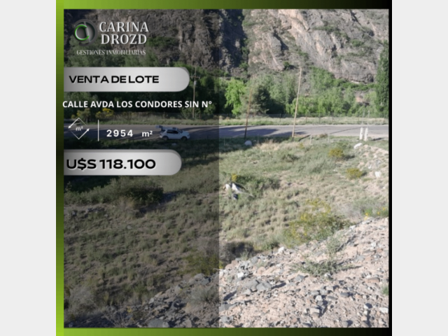 "CARINA DROZD gestiones inmobiliarias VENDE": EXCELENTE LOTE en POTRERILLOS/ EL SALTO, Luján de Cuyo, sobre Avda. Los Cóndores. Límite Oeste da hacia el "Arroyo El Salto". SUPERFICIE: 2.954 m2 - Frente y Fondo: 52 m y 58 m. SIMETRICO- SERVICIOS: Luz (tiene pilastra colocada), gas envasado, Derecho de riego, posibilidad de conexión al agua potable desde el loteo posterior. Recolección de residuos. VALOR: U$S 118.100 (a U$S 40/ m2)- Escucho OFERTAS por pago contado. FINANCIACION Propia a conversar.