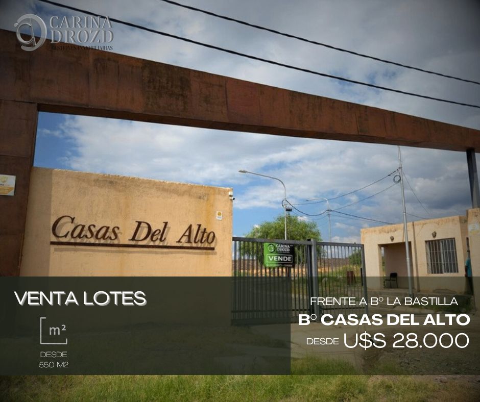 "CARINA DROZD gestiones inmobiliarias" VENDE LOTES en BARRIO “CASAS DEL ALTO”: Sobre AVDA. REGALADO OLGUÍN sin n°, frente al nuevo Centro Comercial "LA BASTILLA", a 300 mts del Bº "Dalvian". Orientación norte. Zona de gran Desarrollo Urbanístico, próximamente se construirá un STRIP CENTER contiguo al Barrio, lo que eleva su plusvalía!- Lotes aptos para Construcción de CASAS o DEPARTAMENTOS (PH)- Cierre con muro. Portón de Ingreso y GARITA con Encargado y Serenos. Cámaras de Vigilancia. Todos los SERVICIOS SUBTERRANEOS, menos luz. Bellas VISTAS a las montañas y a la Ciudad.LOTES desde los 279 m2 a 725 m2 ó más (lotes contiguos)- POSESION y ESCRITURACION INMEDIATA con Escrituras individuales (no condominio). VALORES: DESDE U$S 19.200 (279 m2) FINANCIACION PROPIA: 50% al Boleto y Saldo hasta 24 Cuotas fijas en dólares. Escritura contra Cancelación. OFERTA ESPECIAL! para los lotes: N° 11 (550 m2) U$S 28.000- N° 12 (724 m2) U$S 35.000 y N° 13 (589 m2) U$S 30.000. LOTES 11 y 12 en venta conjunta a U$S 58.000- PAGADEROS: ANTICIPO EL 20% y SALDO EN 24 CUOTAS FIJAS.-