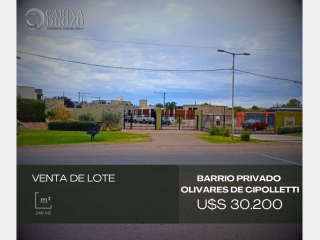 "CARINA DROZD gestiones inmobiliarias VENDE": EXCELENTE LOTE en Barrio PRIVADO "OLIVARES DE CIPOLLETTI", en Luján de Cuyo: Calle Cipolletti 280, a pocos metros de la rotonda de la Virgen y del centro comercial "Terra Malva". Ingreso al Barrio con Portones Automatizados, y Cámaras de Seguridad en todo el barrio. Cierre perimetral de material, electrificado, en todo el perímetro. Con 26 lotes, la mayoría ya construidos o en proceso. Excelentes VISTAS Montañas. El barrio es tranquilo, con muy buena urbanización. SUPERFICIE del lote: 348 m2 - Frente y Fondo: 12,54 m- Lateral Este: 28 m- Lateral Oeste: 27 m- SIMETRICO- ORIENTACION: Norte. SERVICIOS SUBTERRANEOS: luz, aguas, cloacas y gas natural. Calle Asfaltada. VALOR: U$S 30.200- ESCRITURACION INMEDIATA. FINANCIACION Propia a conversar, abonando un 75% de contado. Expensas: $ 25.000 aprox.