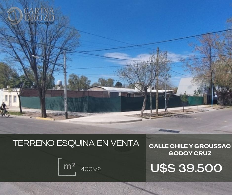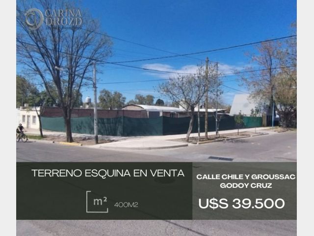 "CARINA DROZD gestiones inmobiliarias VENDE": EXCELENTE LOTE ESQUINA en GODOY CRUZ. Ideal Inversionistas! Calle CHILE 998, esquina calle Groussac- Adyacencia Corredor del Oeste o Hipermercado "Libertad". SUPERFICIE: 400 m2 esquina (18,40m x 22m aprox.)- . - NIVELADO. CERRAMIENTO con cerco Olímpico. Orientación Noroeste. SERVICIOS: en la puerta. VALOR: U$S 39.500. - ESCRITURACION INMEDIATA. FINANCIACION Propia a conversar. Apto PH.